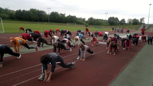 Zum Laufen gehört ebenso das richtige Aufwärmtraining dazu. Durch die fachkundige Anleitung der Übungsleiter des Laufteams der Turngemeinde Kitzingen erfahren die Teilnehmer bei „LAUF 10“ auch entsprechende Dehn- und Kraftübungen vor und nach dem Laufen. Foto: TG Kitzingen