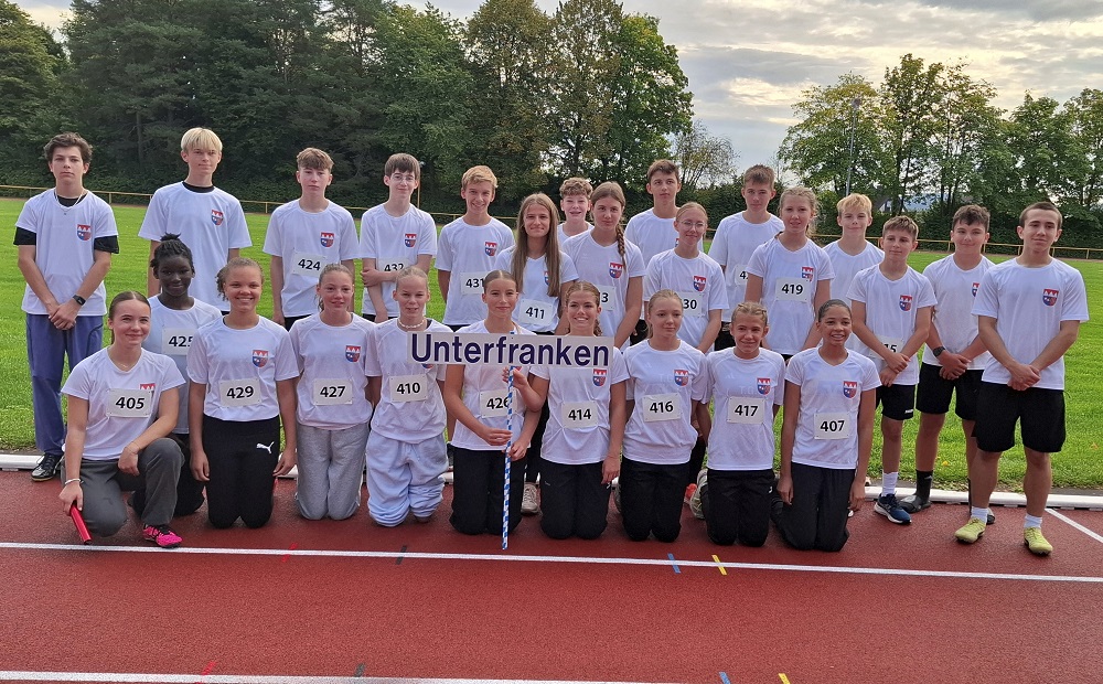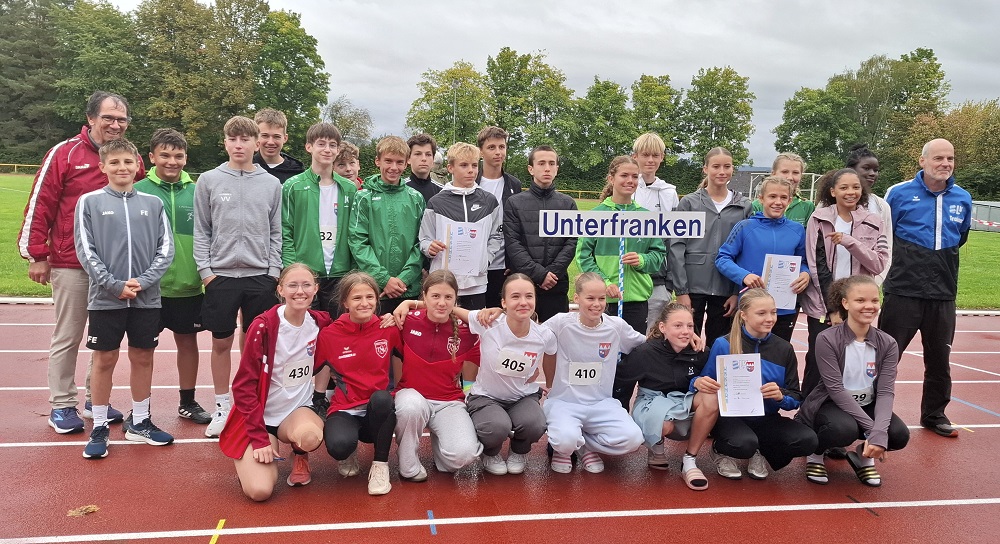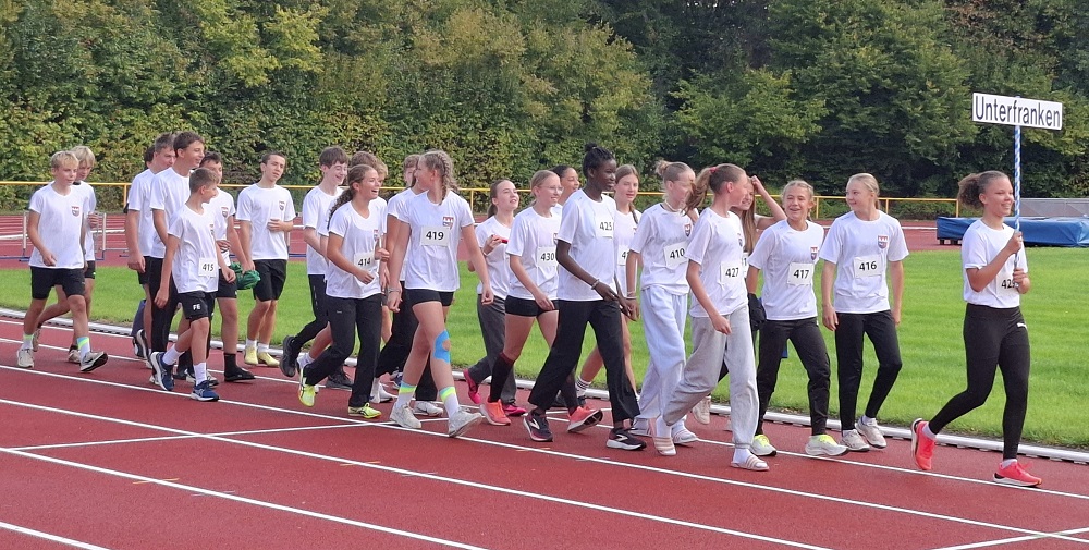 Nun begann das Rätselraten und die Spannung stieg beträchtlich, denn es gab keine Zwischenstände in der Rangfolge. Dann brandete riesengroßer Jubel bei den Jungs auf, denn nach einer ganz starken Vorstellung erreichten unsere Jungs sensationell den 2. Platz hinter Oberbayern, eine gelungene Überraschung. Unsere Mädels mussten sich in diesem Jahr mit Platz 5 begnügen. Doch wir sind zusammen ein Team, wo landet also Unterfranken gesamt als Mannschaft? Ist wieder ein Platz auf dem Podium möglich? Und tatsächlich, Team Unterfranken wiederholt den Vorjahreserfolg und erobert Platz 3, der Jubel der Mannschaft, der Trainer und Betreuer sowie der zahlreichen Fans war enorm. Und es fehlten nur winzige 1,5 Punkte auf den Silberrang. Team Unterfranken repräsentierte auch heuer wieder hervorragend die unterfränkische Leichtathletik. Bernhard Schäfers und Markus Vogel freuten sich aber besonders über den vorbildlichen Teamgeist und das schön zu beobachtende Zusammenwachsen der Athletinnen und Athleten.